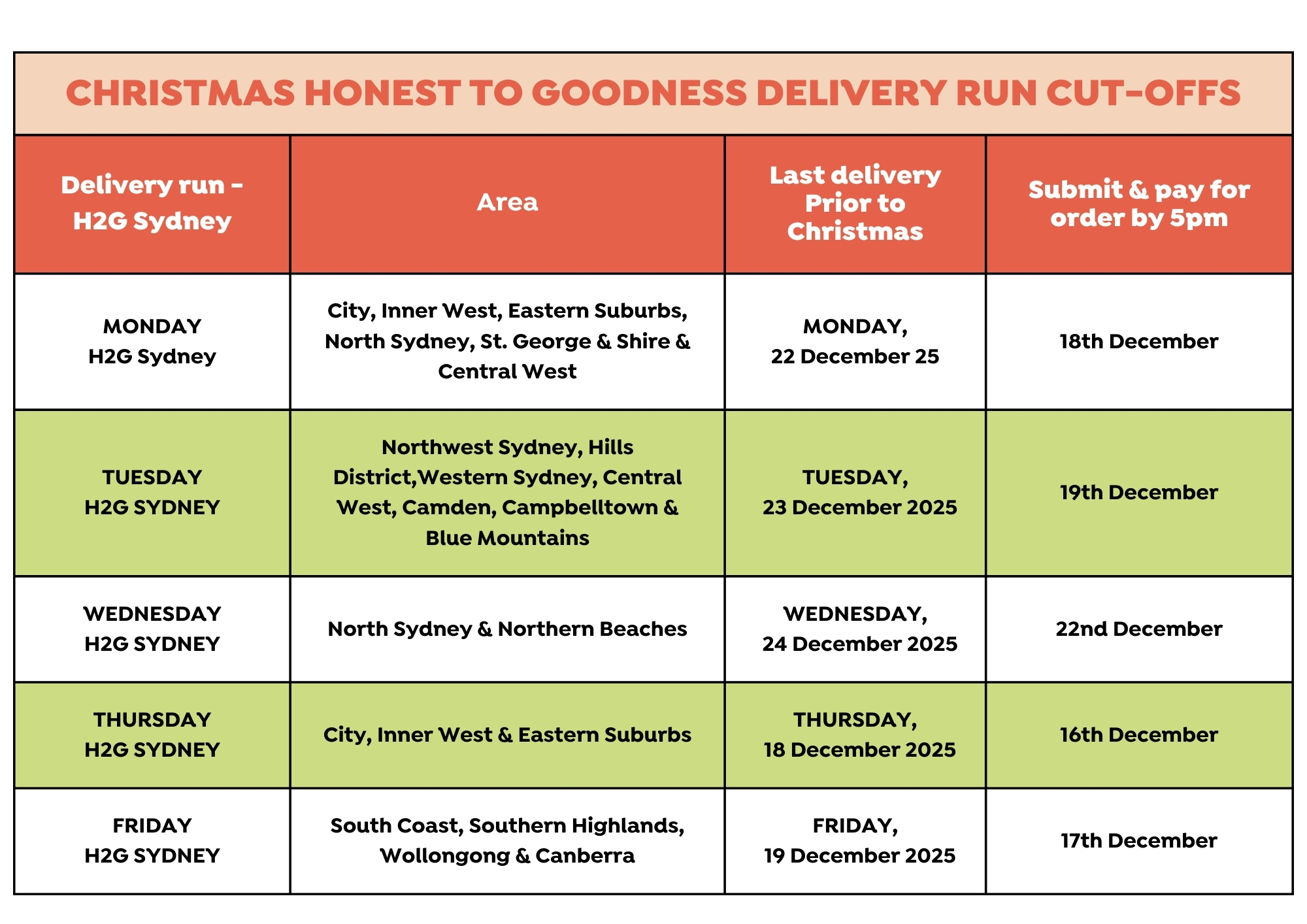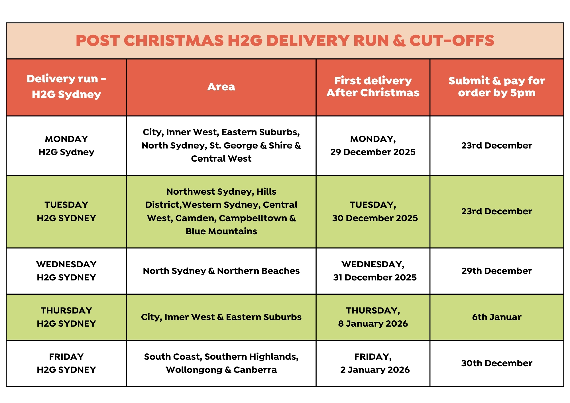 - H2G Delivery Sydney: If your business is closing early on Christmas Eve, please contact our Customer Service team at least 24 hours prior to delivery. A delivery fee may be charged if your store is closed early and the products need to be re-delivered.